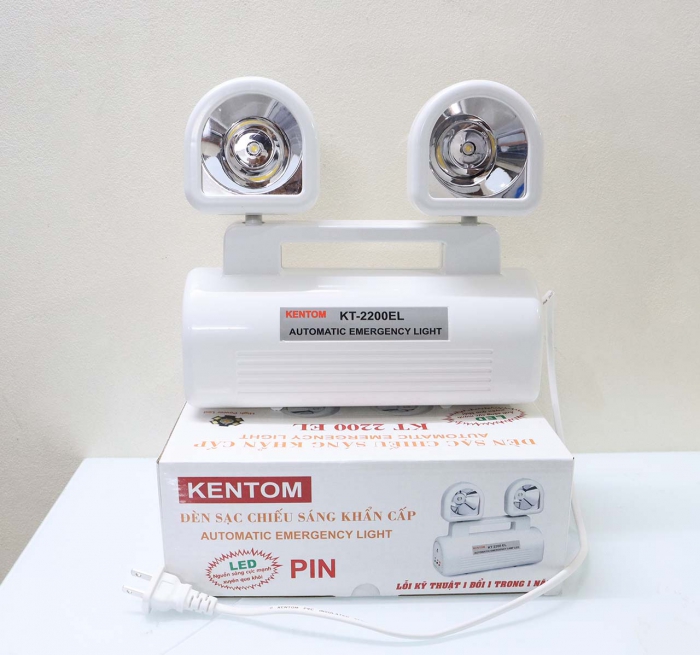 Sản phẩm: Đèn Sạc Khẩn Cấp KT – 2200EL (Đèn Mắt Ếch) Xuất xứ: KENTOM -Việt Nam Thông số kĩ thuật: • Nguồn điện sạc : AC 220V/50Hz • Bóng đèn: 6V 6 W x2 bóng • Bình ắc quy khô: 6V 5Ah • Dòng điện sạc: 250 mA • Thời gian sạc: 24 giờ • Thời gian thắp sáng: 2 giờ Chứng từ đi kèm: • Có đầy đủ chứng nhận xuất xưởng. • Có Dán tem kiểm định PCCC (Giấy Chứng nhận kiểm định phương tiện phòng cháy và chữa cháy)